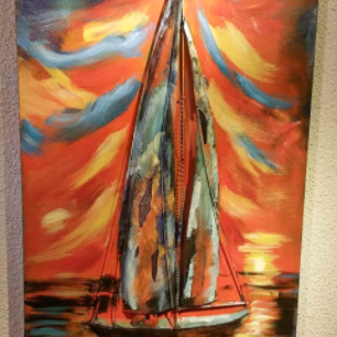 In Ruhe liegt das Segelschiff auf dem Wasser, während die Segler auf dem Metallbild in 3D 'Nubes Rojas' den traumhaften Sonnenuntergang genießen. Die untergehende Sonne färbt das Boot und die blauen Wolken in warme Rot- und Orangetöne, wodurch sich eine eindrucksvolle Kulisse auf dem handgefertigten Relief entfaltet. Mit großer Detailgenauigkeit trittt das Schiff in Ihrem Hotel fühlbar auf der Metallfläche hervor.