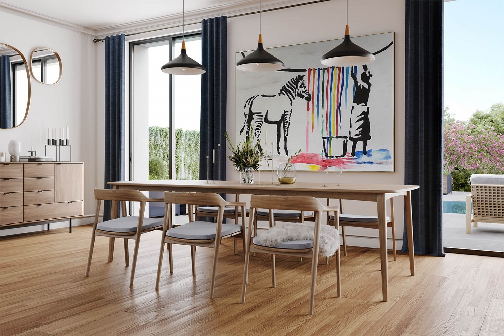 Große Gemälde, Leinwände und Rahmen brauchen ausreichend Raum, um ihre Wirkung zu entfalten. Sie funktionieren als zentrales Element und sollten deshalb auch möglichst prominent aufgehängt werden. Am besten Sie hängen das Gemälde mittig über einem ebenfalls zentralen Möbelstück auf. Klassischerweise ist das über dem Sofa, aber auch über einem Sideboard oder über dem Kamin entwickelt ein großes Bild seine Strahlkraft.