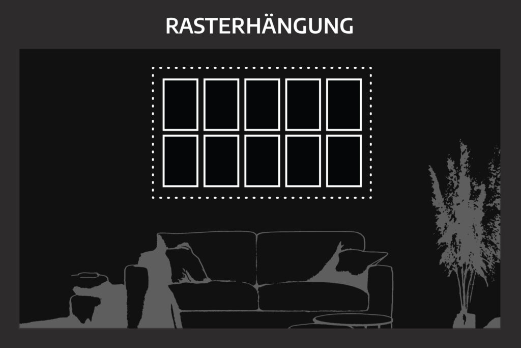 • Der Platz bestimmt die Anzahl der Fotos. Dennoch ist die Rasterhängung für alle Raumgrößen geeignet, da sie eine strukturierende Atmosphäre schaffen.